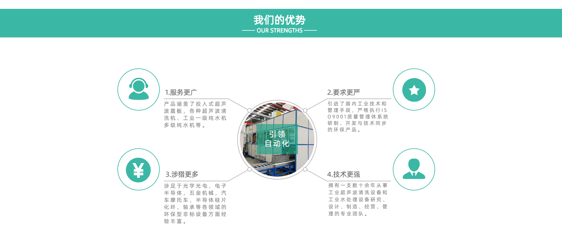 天津市引領(lǐng)自動(dòng)化科技有限公司是由一支擁有數(shù)十余年工業(yè)超聲波清洗設(shè)備和工業(yè)水處理設(shè)備研究、設(shè)計(jì)、制造、經(jīng)營、管理、銷售、服務(wù)于一體的企業(yè)。 公司匯集了一批長(zhǎng)期致力于工業(yè)清洗設(shè)備和工業(yè)水處理設(shè)備研發(fā)、設(shè)計(jì)、制造的人才,引進(jìn)了國內(nèi)外的工藝技術(shù)和管理手段,嚴(yán)格執(zhí)行ISO9001質(zhì)量管理體系,研制、開發(fā)與技術(shù)同步的環(huán)保產(chǎn)品。選用日本、美國等原材料、元器件,以設(shè)備、熱忱的服務(wù)、合理的價(jià)格為廣大用戶提供質(zhì)量穩(wěn)定、外形美觀的十多個(gè)系列、百余個(gè)規(guī)格的超聲波清洗設(shè)備、高壓噴淋清洗設(shè)備、工業(yè)水處理設(shè)備。產(chǎn)品涵蓋了投入式超聲波震板,單槽式超聲波清洗機(jī)、多槽式超聲波清洗機(jī)、氣相型清洗機(jī)、自動(dòng)型超聲波清洗機(jī)、碳?xì)漕惓暡ㄇ逑礄C(jī),高低壓噴淋清洗機(jī)等以及工業(yè)冷水機(jī),工業(yè)一級(jí)純水機(jī)多級(jí)純水機(jī)等。 產(chǎn)品具備完善的售前,售中,售后服務(wù)制度。尤其在開發(fā)設(shè)計(jì)光學(xué)光電,電子半導(dǎo)體,五金機(jī)械,汽車摩托車,電池,半導(dǎo)體硅片,化纖,軸承等各領(lǐng)...